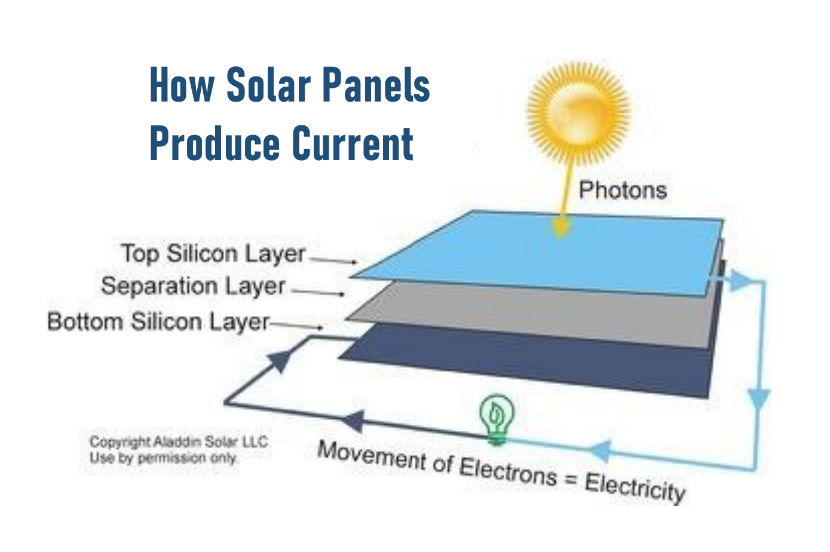 When sunlight strikes a solar panel, electrons on the top side get channeled through a wire to the bottom, and—presto—an electrical current is produced.